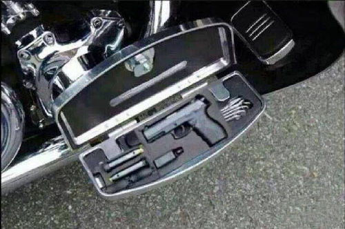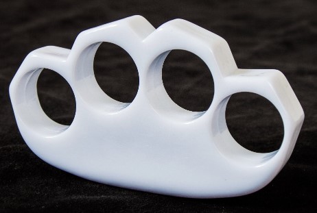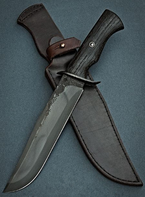 Atop this is a well-worn Brando-style black leather jacket, more or less regardless of the weather. Visible tattooing include '1310' in Old English font on his left knuckles, the second 1 partially obscured by a gray ring with Widmanstatten pattern and bone between strips of titanium. A man of little adornments, there's only a chrome chain that keeps wallet in right back pocket attached to his belt. On occasions where appropriate, he wears a large buck knife from his belt at his right thigh.