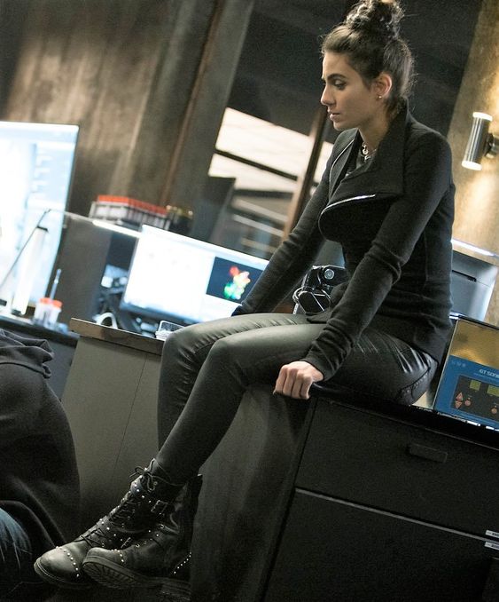 Currently she is wearing black skinny jeans tucked into black leather boots that reach her mid-calf. Her fitted but faded grey graphics t-shirt has a 1950s Batman and Robin on it, peeping through her smart-looking black blazer worn open.