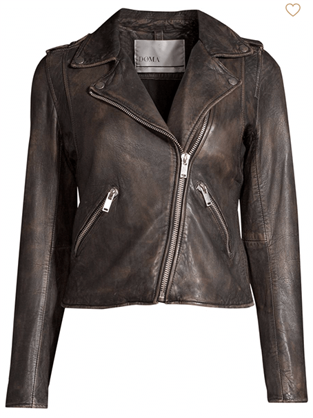 She wears a simple, deep v-neck tee, neckline dipping low enough to show the lacy and decorative piping of what looks like a very expensive piece of lingerie. A long, delicate chain dips around her neck, tiny hammered discs of rose gold strung along it. They glitter faintly in the light as she moves. An oval locket etched with a rose also hangs between her breasts, visible because of the low dip of that soft cotton neckline. She wears a cropped moto jacket in washed leather, brown-black, with a notched collar and long sleeves, closed asymmetrically with a zipper. Dark blue skinny jeans and a pair of bright yellow, vintage Mary Jane heels complete the look.