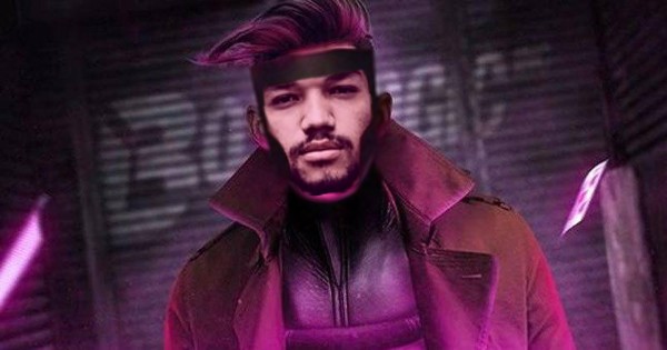 A curious look as the man is wearing a taupe/dark brown trenchcoat. Dark blue pants with a purple shirt. Double belts going across the waist and abs. Over the purle shirt is a dark blue pattern, with it going over to cover part of his head as a helmet, leaving his face open.The hair poking out above, and currently fixed to be straight instead of the usually curly.A stack of cards in a pocket on the inside of the trenchcoat. On his feet are metallic looking boots, in a silverish color. Finishing the look with a long metal rod. https://upload.wikimedia.org/wikipedia/en/thumb/9/94/Gambit_%28Marvel_Comics%29.png/250px-Gambit_%28Marvel_Comics%29.png