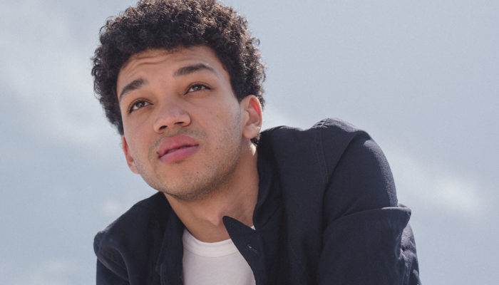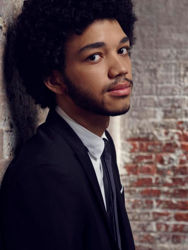Dark curly hair sit upon a long face. His long brows frame the dark brown eyes. His nose broad and leading down to wide full lips. Some facial hair kept trimmed lay along his jawline and chin, with some going around his mouth.