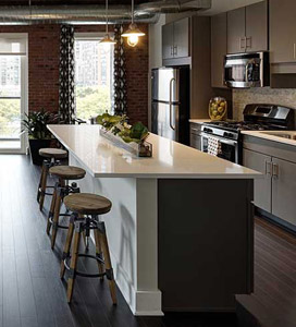 The kitchen has a long white quartz counter with stools in front of it, and dark grey Swedish-style cabinetry with stainless appliances. Tucked into one corner of the open floorplan is a more modern desk, set up with a very high end computer system, large monitor, and various peripherals, clearly the 'home office'.