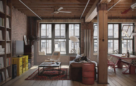 The living area has the exposed brick left unpainted with unfinished wooden cube shelves lining a wall, and old industrial painted desk supporting a widescreen television, a comfortable suede couch, modern armchair, old filing cabinet, painted oil drum, and wood and metal coffee table serving as surfaces. There is television, stereo, and video game console equipment in the desk cubbies. The dining table is made of an industrial kitchen counter, with a heavy weight gear system intended to raise and lower it for various dough rolling and packaging purposes. Metal chairs are set around it, and Edison bulbs hang from cords above for lighting.