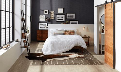 This pricey loft apartment is a mix of industrial and shabby chic.. There are pipes visible in the uncovered beam ceilings, ventilation ducts visible here and there, and the flooring is stylishly mismatched in an unique patchwork of original wide plank pine barnwood floors in the living area, updated dark stained glossy hardwoods in the kitchen, and whitewashed greyish ash flooring in the bedroom and bathroom.