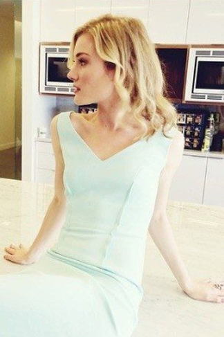 Standing at 5'6", this young woman looks to be in her mid-20s, with blonde hair in a shoulder-length style and bright blue eyes. Her makeup and clothing are stylish and conservative. She's wearing an A-line black mini-skirt over opaque black tights, and a white, silk "pajama style" blouse with black piping, with high heels. Every detail, from jewelry to shoes, is impeccable.