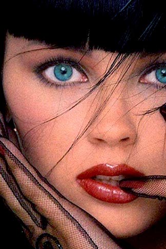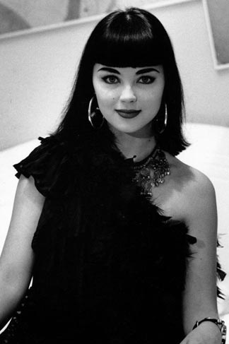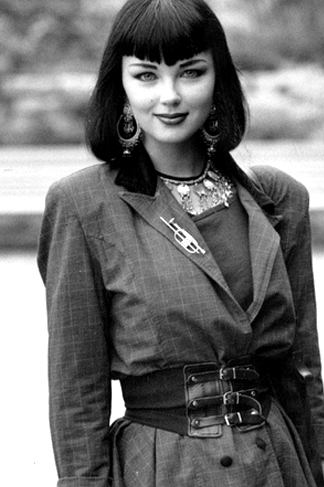 Standing 5'6", this woman is clearly of Scandinavian heritage. her pale skin and bright blue eyes speak to her ancestry, and her jet black hair makes both stand out. her hair is in a shoulder-length bob with straight bangs, her lips are painted a deep red, and her makeup is glamorous. Her skin bears no markings, no tattoos or piercings, and she dresses in vintage clothing of a 40s and 50s vein.