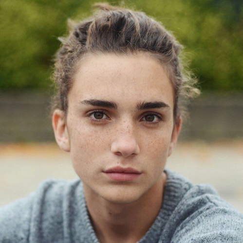 One would be forgiven if they mistook Turner for a girl. His brown hair is long and thick, with natural curls that brush his shoulders when let down, though it's usually worn in a high knot, swept back from his face. His skin is pale, a smattering of freckles . His eyebrows are dark and well groomed. His eyes are large, golden brown, and rimmed in thick lashes. His face is prettier than it is handsome, his jaw defined but tapered, his chin small, a blunted point. His neck is slender and perhaps longer than proportional, a faint Adam's apple visible.