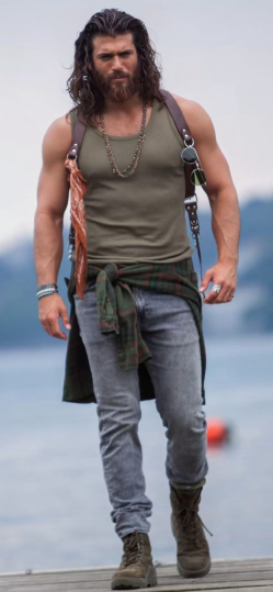 His choice of clothing is usually simple, consisting of earth-toned linen button-downs or light cargo-trucker jackets over white tees or tanks. He's almost universally seen in jeans and hiking or worker boots, as if he's always prepared to travel somewhere, and comfortably. Prayer beads are usually worn loosely around his neck or wrists, as well as necklaces with some spiritual significance. Equally likely are shemagh scarves or handkerchiefs around his neck or tied to an arm. He also likes nice shades.