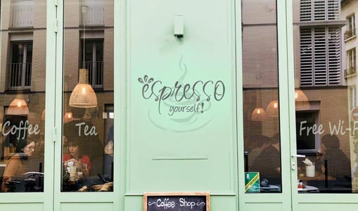 Over the front door of 'Espresso Yourself' is a black iron hanger bearing a round sign in Tiffany blue, with the shop logo on it. On the windows, in silvery etching, are the words 'Coffee', 'Tea', and 'Free Wi-Fi'. The brick facade has been whitewashed and the folding doors are painted the same blue as the sign, with silver hardware. On a signboard out front are the shop's hours.